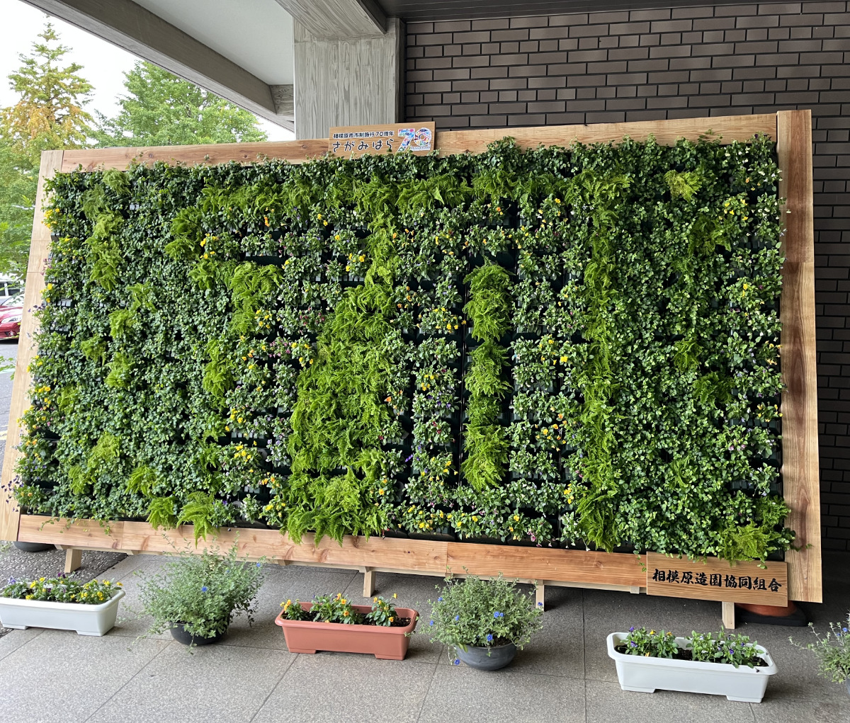 相模原市役所本庁舎の玄関前に市制施行70周年を祝う「フラワーウォール」が10月21日にお目見えした。相模原造園協同組合(小山重樹理事長)の協力で実施したもので、色とりどりの花が利用者らの目を楽しませている。