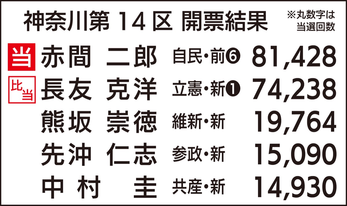 第50回衆議院議員総選挙は10月27日に投開票され、神奈川第14区(相模原市中央区・同緑区・愛川町・清川村)は自由民主党の前職・赤間二郎氏(56)が立憲民主党の新人・長友克洋氏(53)との接戦を制し、6度目の当選を決めた。長友氏は重複立候補した比例区で復活当選した。
