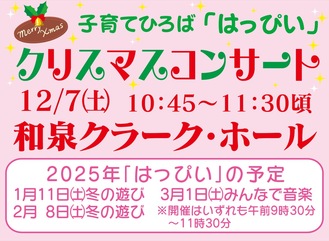 和泉短期大学(佐藤守男学長)が地域の子育て支援の場にと開設している子育てひろば「はっぴい」では12月7日(土)に、和泉クラーク・ホールで『クリスマスコンサート』を開催する(午前9時30分はっぴい受付、10時30分コンサート受付、10時45分〜11時30分開催、駐車場完備)。