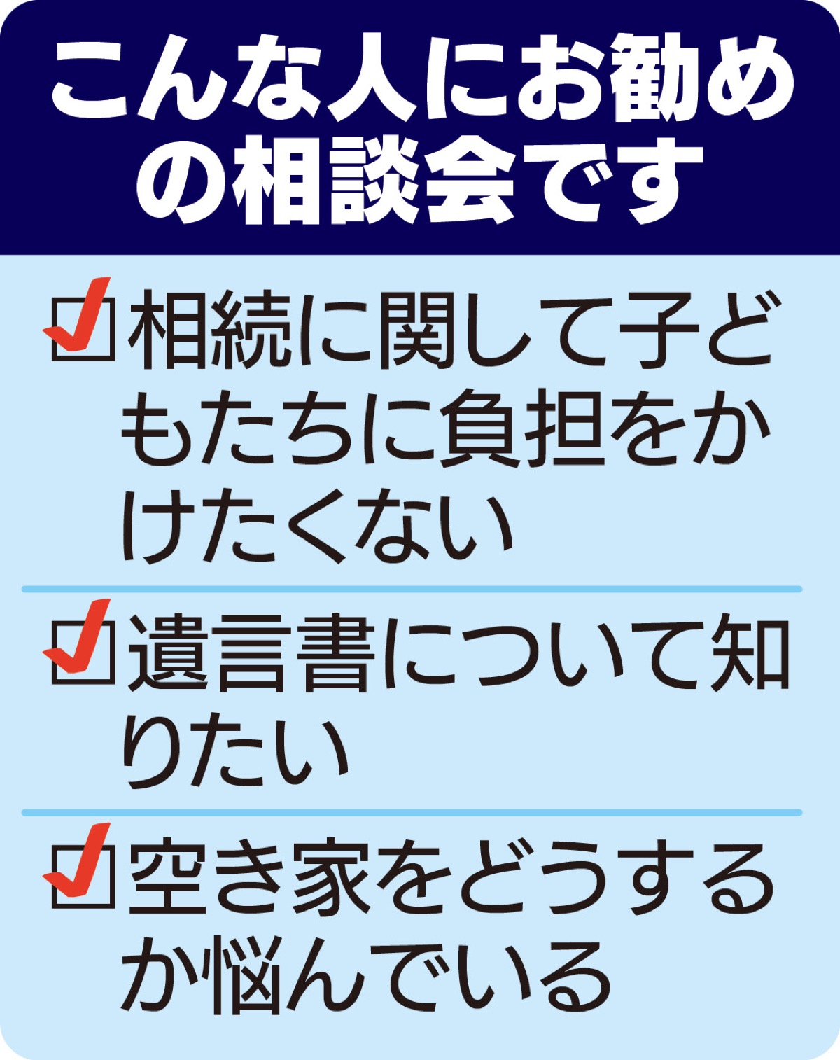 当日、相談に乗るのは弁護士の内田崇彦氏(東京港区・成和パートナーズ法律事務所)や司法書士の森川和明氏(森川司法書士事務所)、税理士の本間康弘氏((株)H&Tアカウンティングファーム)の3者。「今年施行された相続登記義務化により、相続開始後3年以内に登記を行わなければならなくなった。この機会に相談してもらいたい」としている。