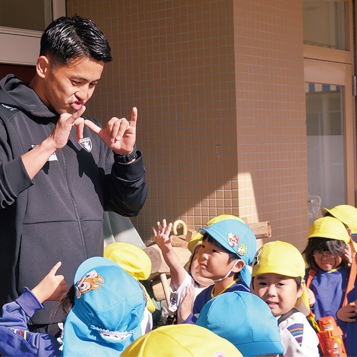 この日は年中児約80人が参加。ボールをバトン代わりにしたリレーや、腰につけた「タグ」を取られないように逃げる遊びなどを楽しんだ。金子亜矢園長は「地元のチームやスポーツに対して、親しみや興味を持つきっかけにしたい」と話していた。