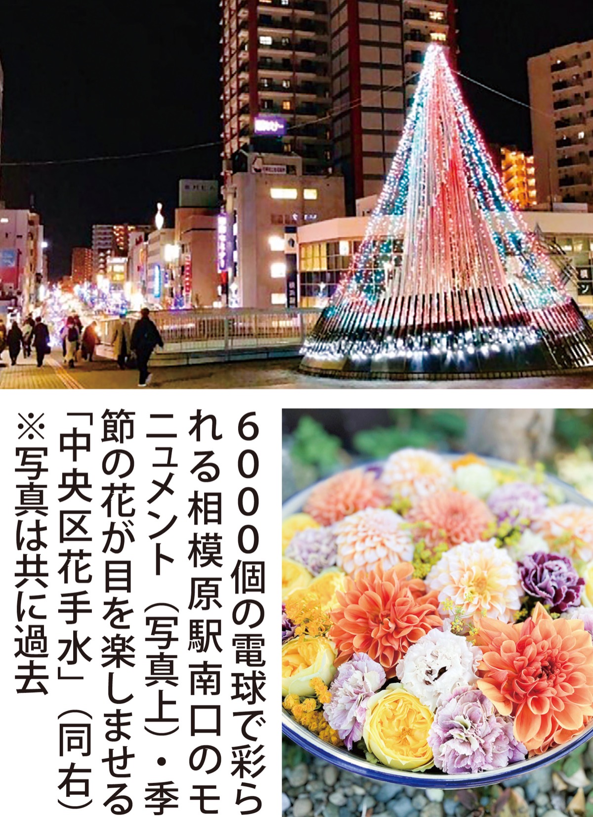 街の魅力づくり事業として季節ごとに実施されている「中央区花手水」と、JR相模原駅南口ペデストリアンデッキで点灯中の「相模原ウィンターイルミネーション」とのコラボレーションが12月18日に始まった。12月25日(水)まで。