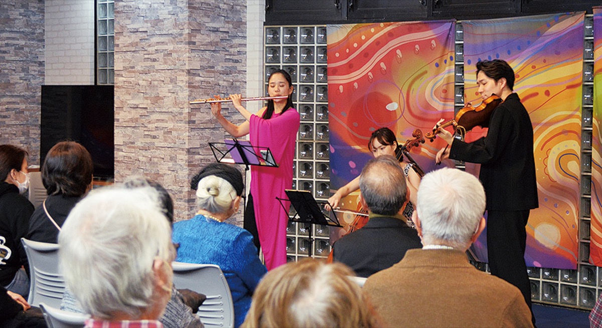 歯科川崎医院中央(中央4の5の9)が12月28日、クラシックコンサートを開催した=写真。子どもから高齢者までの48人が参加し、プロ奏者によるバイオリン、フルート、チェロの演奏を間近で楽しんだ。奏者の動きや息遣いも感じながら「川の流れのように」などの曲を鑑賞した。