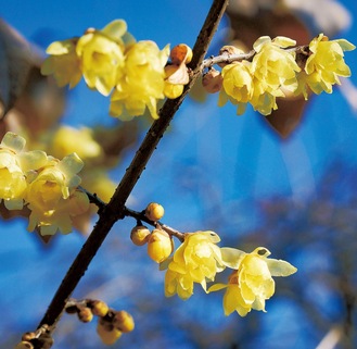 相模原北公園のロウバイが梅より一足早く咲き始め、甘い香りを漂わせている=写真。連休最終日の1月13日は、冬晴れの青空の下、素芯蝋梅(ソシンロウバイ)がほころび、撮影を楽しむ人もいた。