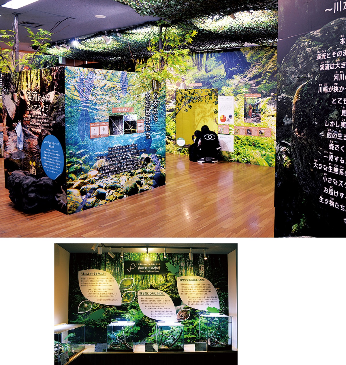 渓流を代表する魚で赤い斑点がある「アマゴ」や、泳ぐ力が強い「アジメドジョウ」、犬のようにワンとなく「ネバタゴガエル」などが展示されている。沖縄や北海道の渓流の生き物や、水源林に暮らすフクロウの一種「アオバズク」なども見ることができる。