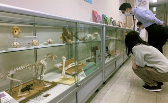 鹿沼台の市立図書館2階に1月15日からツキノワグマやタヌキなど、動物の骨格標本やはく製が展示されている=写真。開館50周年記念事業の一環として行われているもので淵野辺の麻布大学内にある「いのちの博物館」と連携。これまでも大学図書館と関係はあったが、博物館との協力は今回が初だという。