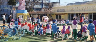 淵野辺ひばり幼稚園で1月17日、相模つばさ幼稚園の園児たちを迎えての交流会が開催された。両園の年長児約110人が参加し、園の垣根を越えてリレーや外遊びを楽しんだ。園児たちは「これつばさ幼稚園にもある」「この遊具はないから楽しい」などと楽しそうに感想を話していた。