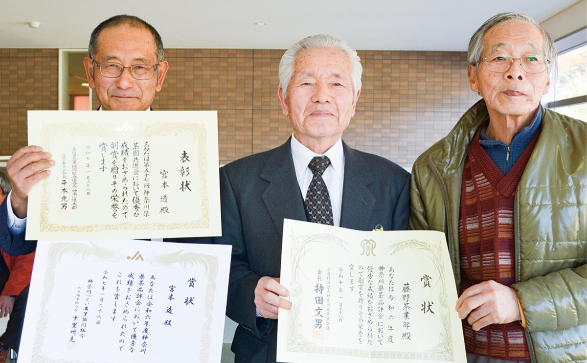 品評会、共進会の市内入賞者は次のとおり(敬称略)。【品評会】▽二等・県農業会議会長賞/藤野茶業部▽二等・神奈川つくい農業協同組合代表理事組合長賞/宮本透▽三等/大河原頼忠、佐野川茶【共進会】▽二等・全国農業協同組合連合会神奈川県本部運営委員会会長賞/宮本透▽三等/落合孝二