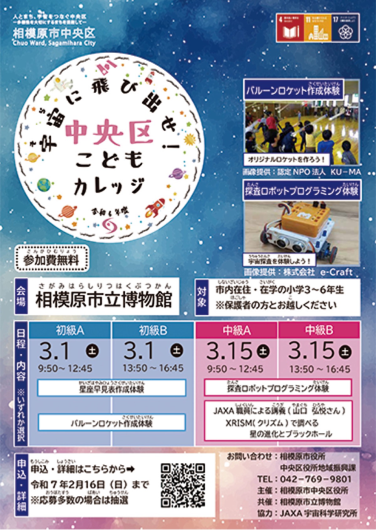 初級コースの1日はバルーンロケットの作成体験などを行い、中級コースの15日は探査ロボットのプログラミング体験などを行う。