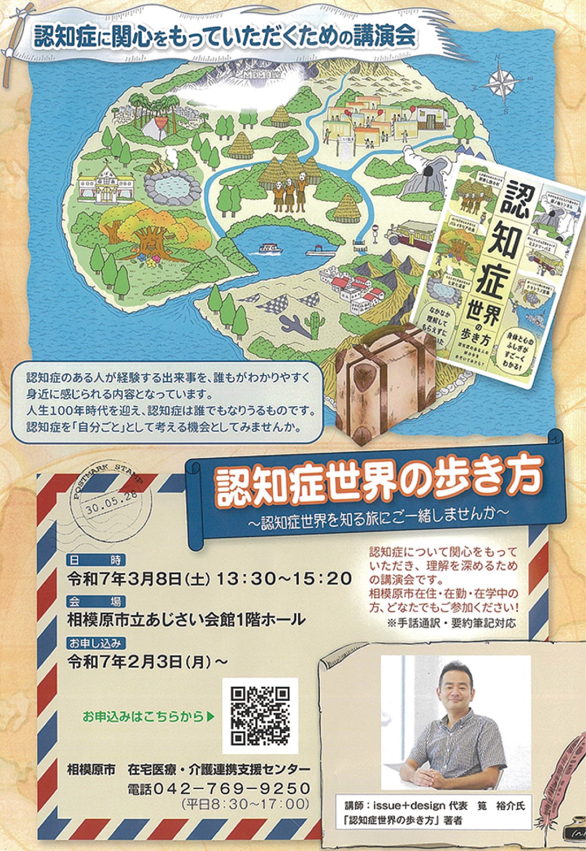 認知症について関心を持ち、理解を深めることを目的とし、累計発行部数が20万部を超えた「認知症世界の歩き方」の著者で特定非営利活動法人「issue+design」の代表を務める筧裕介氏が講師を務める。