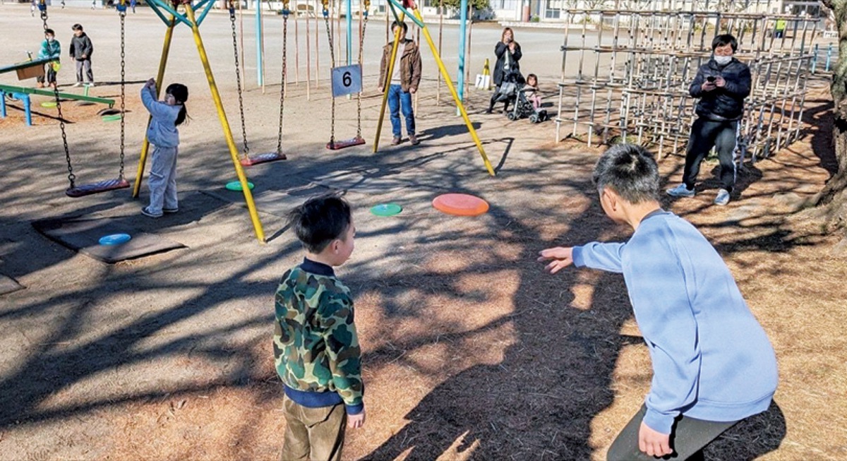 横山小学校で2月9日、横山地区青少年健全育成協議会が主催する恒例のイベント「フリスビー大会」が開催された=写真。22回目を迎えた今回は地域に暮らす大人から子どもまで42人が参加。いかに少ない投数で的に当てられるかを競い合った。