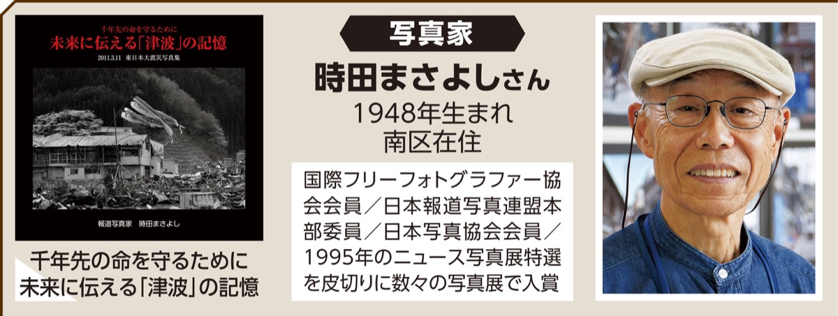 時田さんはこれまで、東日本大震災や糸魚川の大火などの被災地をテーマとした報道写真集を出版。「被災地の現場がもっと報道され、それが一般市民の人たちの目に触れることが重要。それを教訓として生かさなければいけない」と地元・相模原市内を中心に写真展を開催してきた。