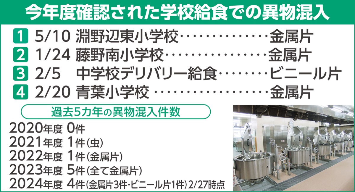 市の発表によると、今年度中に学校給食で異物の混入が確認されたのは4件(金属片3件、ビニール片1件)。金属片の混入は全て小学校給食で確認された。