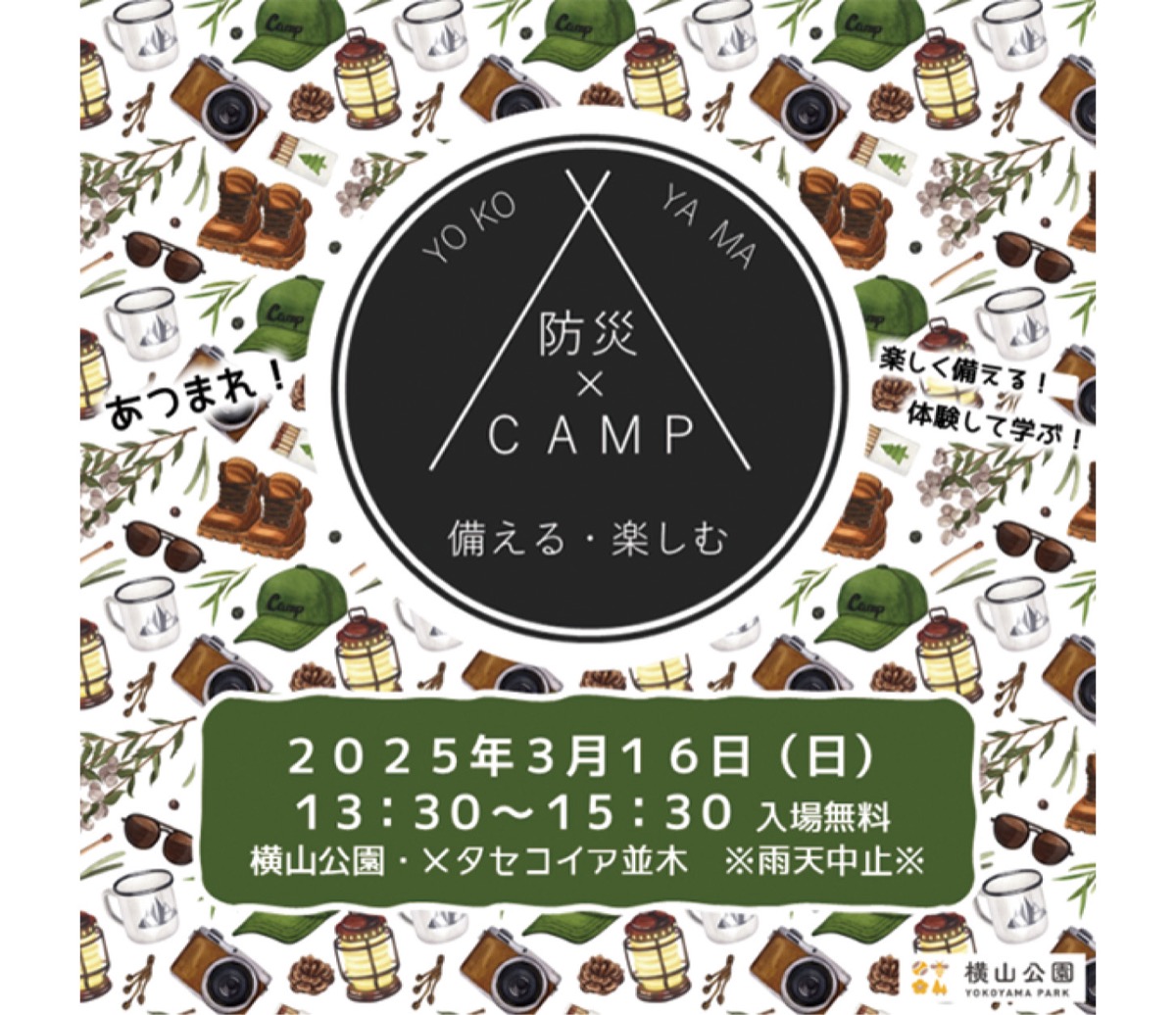 楽しみながら「いざ」という時のための備えを学ぶ体験型イベント「よこやま防災×CAMP」が3月16日(日)、横山公園(横山5の11の50)で開催される。入場無料(一部有料)。午後1時30分から3時30分まで。