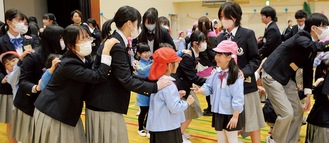 体育館に100人ほどの園児を迎えたこの日の幼中交流会は、東京ディズニーリゾートのキッズダンスプログラム「ジャンボリミッキー!」で幕開け。ダンスで緊張がほぐれた園児と生徒は、生徒有志20人で組織した実行委員会が考えたメニューに汗を流した。