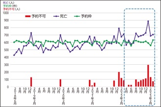 現在、相模原市にある火葬場は市営斎場(南区古淵)のみ。22年度の市営斎場の実績値を見ると、火葬までに必要な日数は1月で平均10日。22年度中に予約できなかったケースは1012件に上る(上記グラフ点線内)。市内で予約ができなかった場合、愛川町や厚木市などの斎場を利用するケースも少なくないが、該当地域の住民以外は利用料が割高になる。
