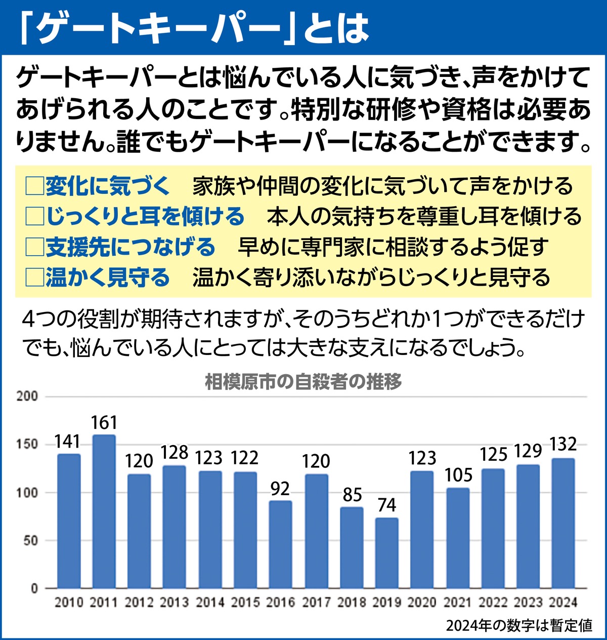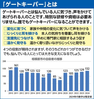 ゲートキーパーは「命の門番」と呼ばれ、相手の異変に気付き、医療機関や専門家への相談を促すなどし支援する存在で、有資格制度ではない。同局の担当者は「それぞれの立場で日頃の取り組みの中に『寄り添う』という視点を取り入れているなら、それはもう『ゲートキーパー』です」と話す。あえて意識はしていない行動がすでに「ゲートキーパー」としての役割を果たしていることが多いという。