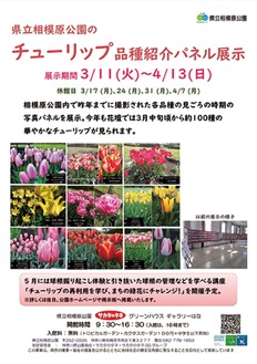 春を彩るチューリップの多様な品種を写真で紹介するパネル展が4月13日(日)まで、県立相模原公園(相模原市南区)で開催中だ。今年で3回目となる同展では、園内で昨年までに撮影された各品種の見ごろの写真が展示されている。