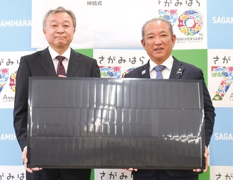 まちのいたるところで発電--。こんな技術を普及させようと、相模原市は3月7日、軽くて曲がる次世代太陽電池を開発している株式会社PXP(緑区)と連携協定を締結した。公共施設などを活用し、従来型では難しいとされる場所にパネルを設置して国内では初となる実証実験に取り組むという。