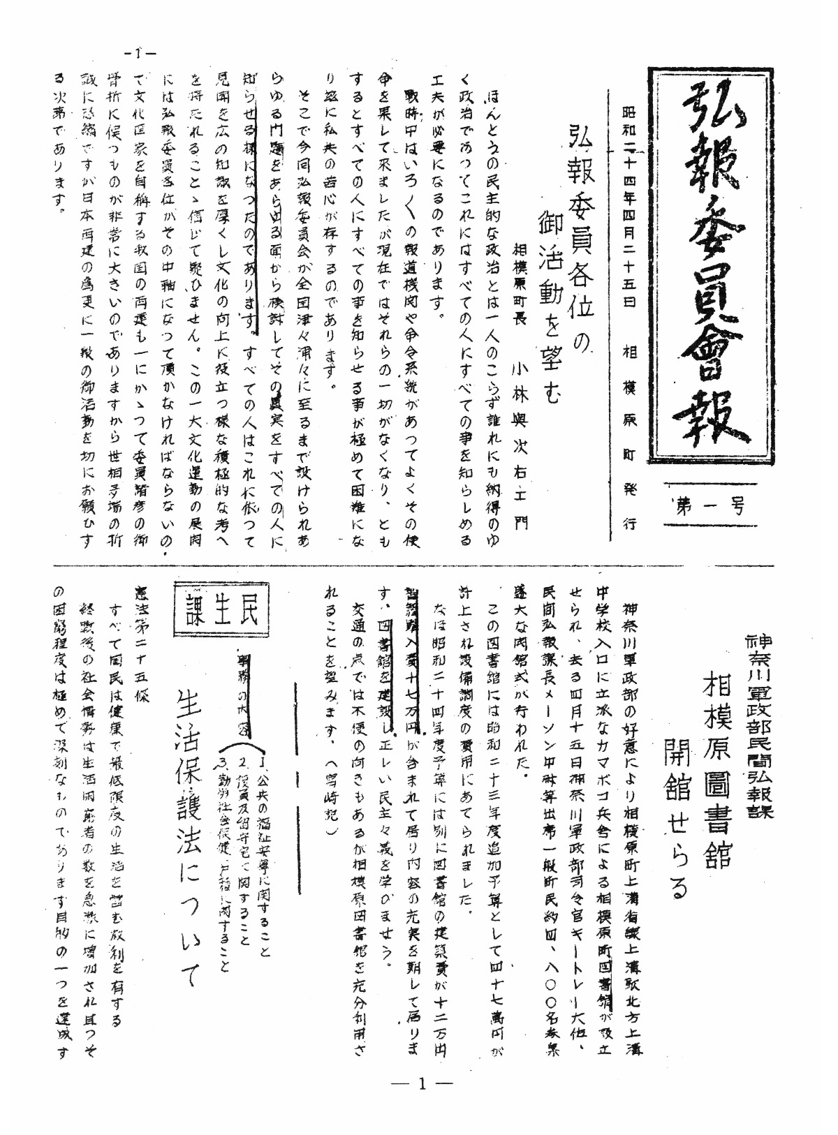 デジタル化して今回追加された資料は約4200点。歴史的公文書約30点、図書館資料約80点に加え、歴史、民俗、天文など多岐にわたる博物館資料約29,740点など大幅に拡充。1949(昭和24)年4月25日に発行された「広報さがみはら」の第1号など広報紙約1,670点、指定・登録文化財の写真約180点も公開された。