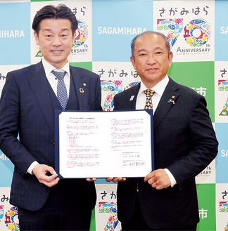 市役所で行われた締結式では、本村賢太郎市長と田中社長が協定書にサインし、互いに固い握手を交わした。本村市長は「これからも交流を続けてワクワクする相模原づくりのお力添えをいただきたい。民間の発想や活力、英知を行政にいただきながらチャレンジする相模原に変えていきたい」とあいさつ。