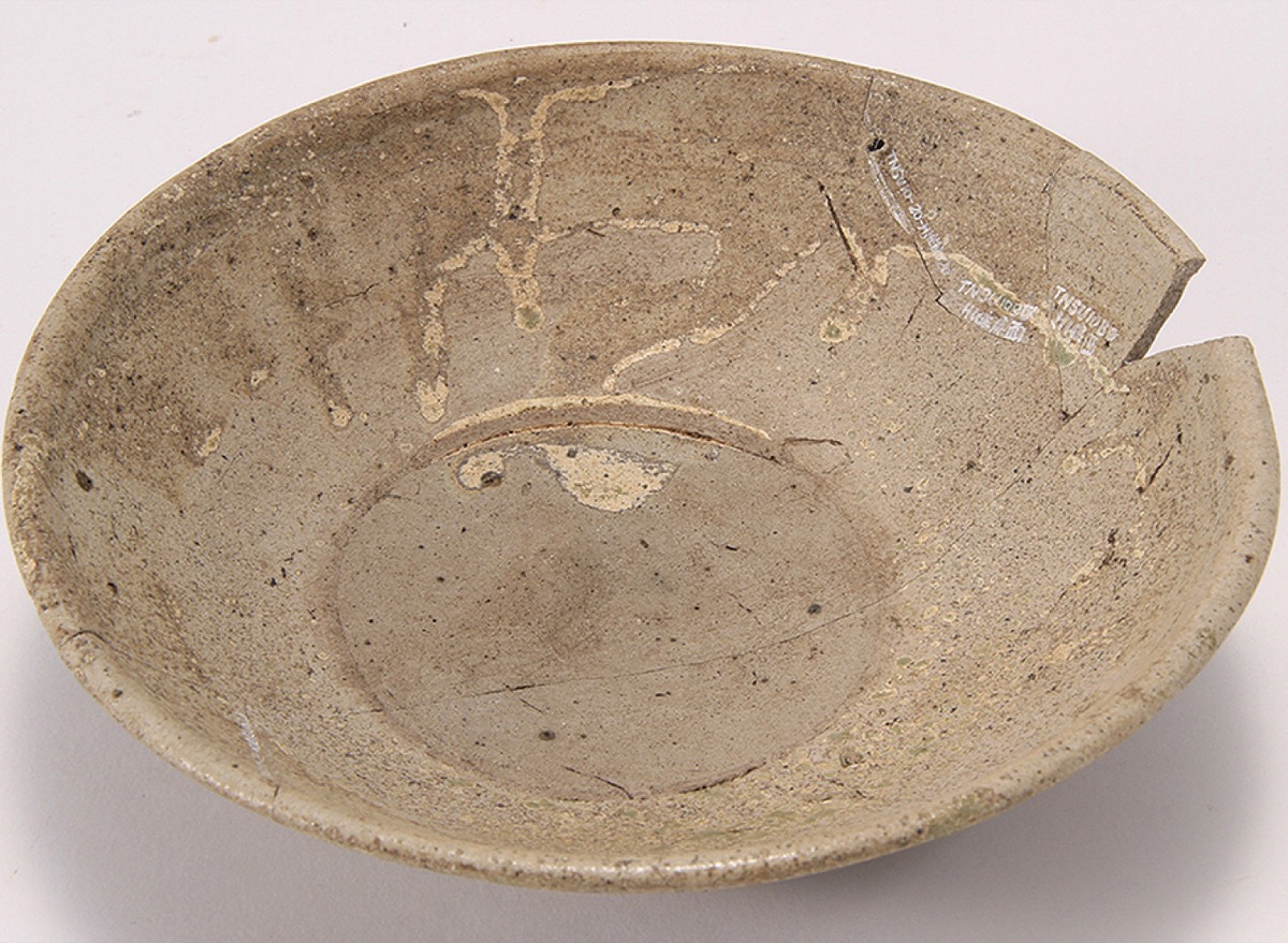 1000年以上前の平安時代に東海地方で焼かれた灰釉陶器(かいゆうとうき)のお碗です。灰釉陶器は植物灰を原料とした焼き物で、釉薬を塗って作られています。今回展示するものは口の部分が少し欠けていますが、全体が残っている新資料です。淡いオリーブ色で、釉薬が玉ダレした趣ある逸品です。(学芸員:中川真人さん)