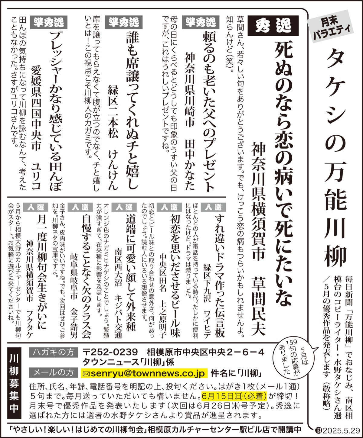 タウンニュース相模原支社では毎月月末号に掲載される「タケシの万能川柳」の川柳を募集しています。投句いただいた作品は毎日新聞「仲畑流万能川柳」などでおなじみの水野タケシさんが選句します。応募方法は枠内に。