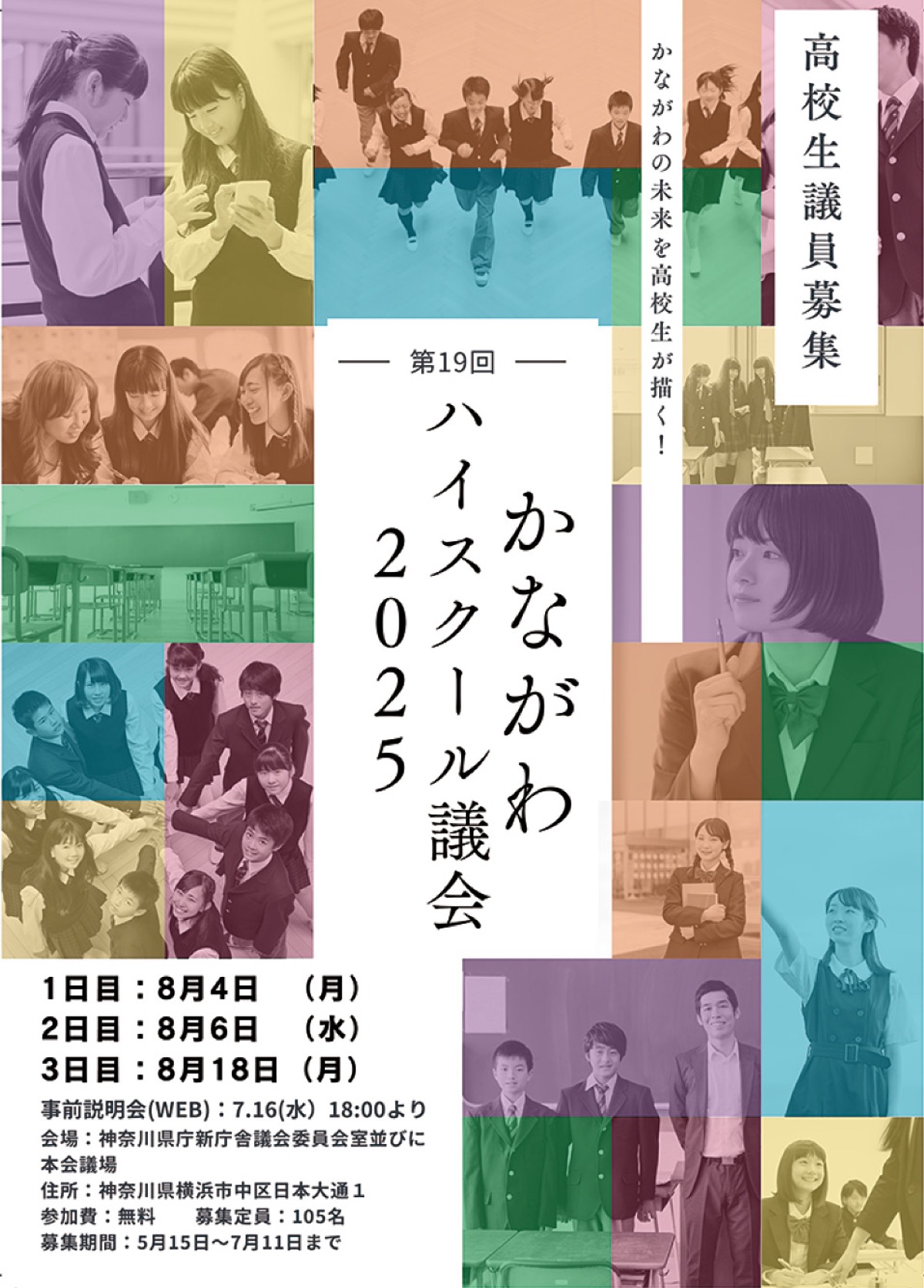会場は県庁新庁舎(横浜市中区)。開会式と委員会が行われる8月4日(月)、6日(水)、本会議が行われる18日(月)の3日間に参加できることが条件。募集期間は7月11日(金)まで。オンラインの事前説明会が7月16日(水)午後6時から行われる。参加無料。募集人数は105人。問い合わせは同協議会の芳垣さん【携帯電話】080・1150・2893へ。