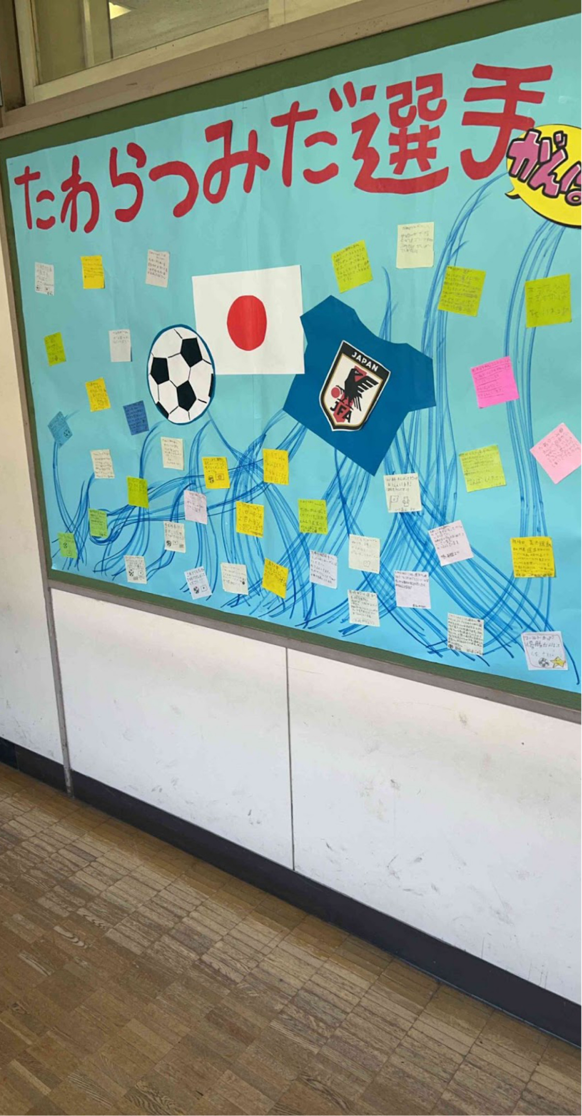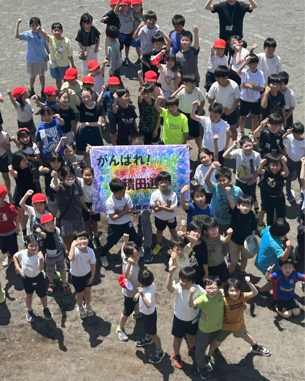 「俵積田選手が日本代表に選ばれたことを知り、6月の講話朝会で全校児童に紹介をしました。応援の気運が一気に高まり、PTAの協力のもと、応援のメッセージと応援旗を大急ぎで作成しました。応援旗の手形には、子どもたちの応援パワーが込められています。俵積田選手の活躍は子どもたちの励みです。全校で応援しています」