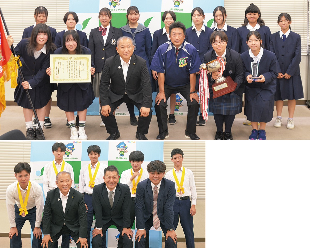 相模原市内で活動する中学生軟式野球チーム「相陽クラブ」(男子/内藤博洋監督)と「相模原ハイドレンジャーズ」(女子/田野倉利男監督)の選手たちが6月2日、市役所を訪れて春の大会で好成績を収めた喜びを本村賢太郎市長に報告した。