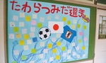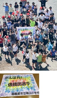 「日本代表に選ばれたことを知り、6月の講話朝会で全校児童に紹介をしました。応援の気運が一気に高まり、PTAの協力のもと、応援のメッセージと応援旗を大急ぎで作成しました」。出身校である相模原市立横山小学校(中央区横山台)の佐藤由起校長はそう話す。応援旗には児童の手形を押し、「後輩」たちのエールを可視化した。「子どもたちの応援パワーが込められています。俵積田選手の活躍は子どもたちの励みです。全校で応援しています」