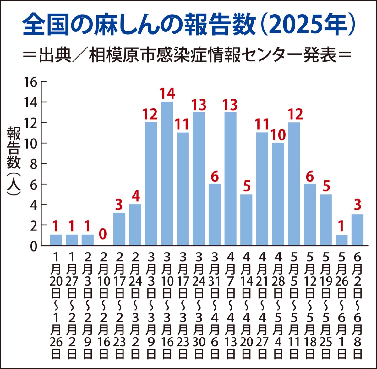 当該患者は5月30日に職場で麻しん患者と接触。6月11日に発熱し市内の医療機関を受診。翌12日に麻しんと診断が確定した。予防接種歴はあり、海外渡航歴はない。