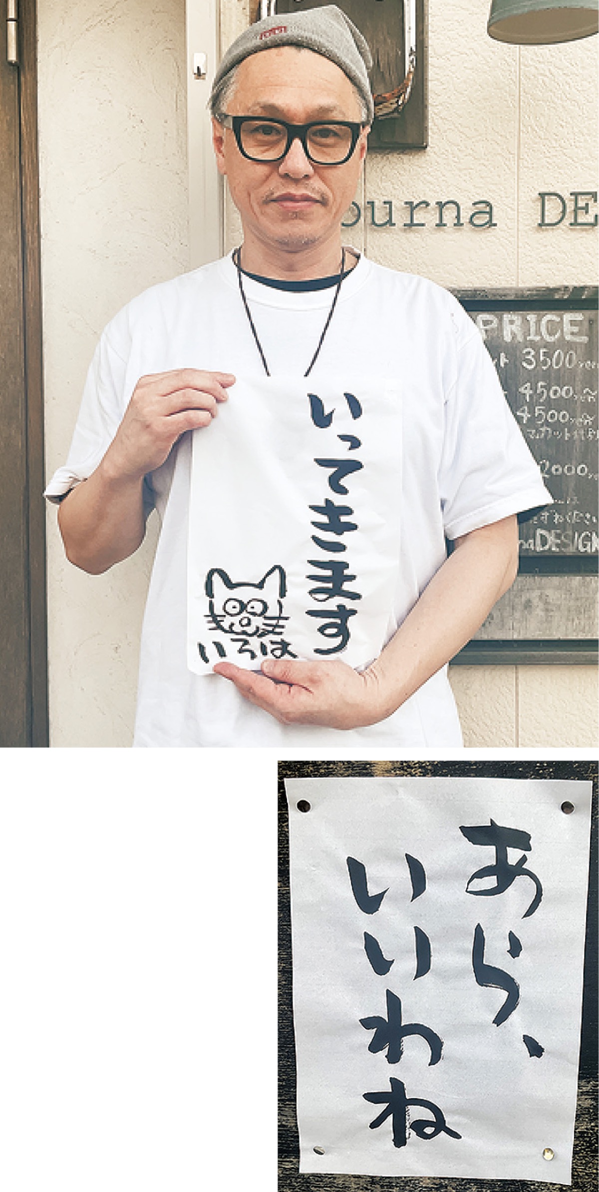 上溝本町交差点のほど近くに、毎日変わる看板がある。美容院Fourna DESIGN(上溝6の20の1)の笠原貴史店長が毎朝、思いついた言葉を筆で半紙にしたため看板に張り付ける。11年続く日課だという。