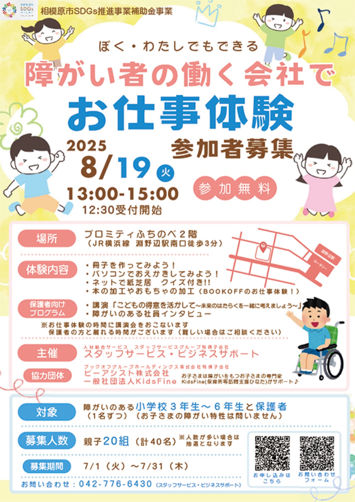 障害のある小学3〜6年生を対象にしたキッズインターンが8月19日(火)、プロミティふちのべ(鹿沼台1の9の15/淵野辺駅南口徒歩3分)2階で開催される。子どもたちに仕事のさまざまな選択肢を知ってもらおうと、障害者雇用を推進する株式会社スタッフサービス・ビジネスサポートが企画した。事務作業や加工の体験を予定している。
