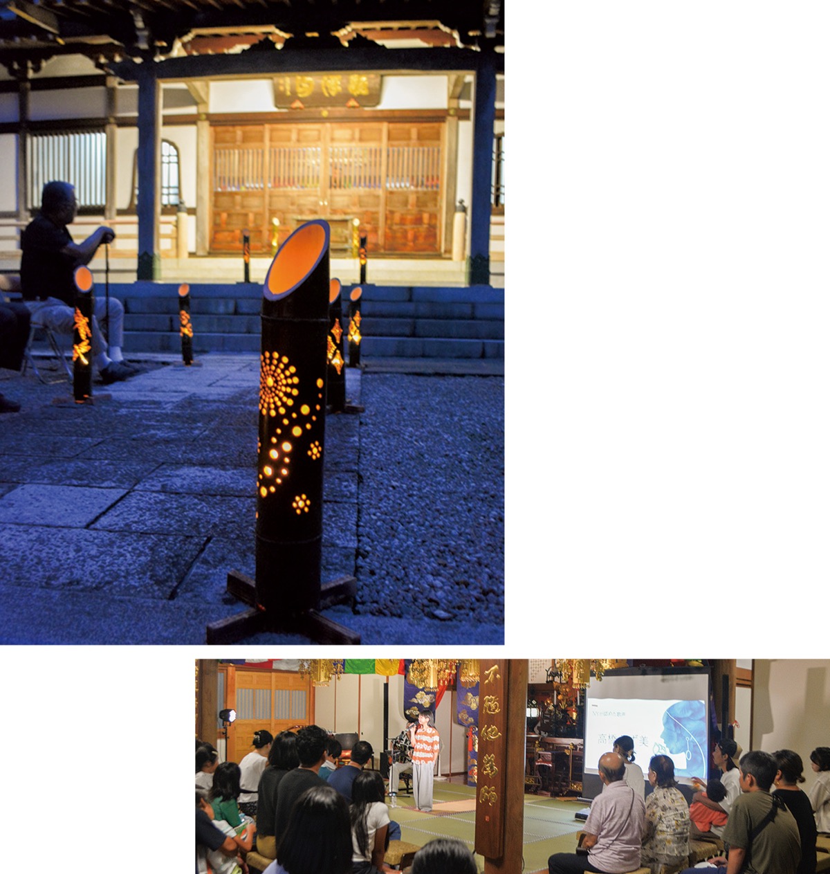 境内には竹灯籠が灯された。「寺は仏の世界の直前にある。火を灯してご先祖様が迷わないように」。永保住職はその意図を参加者に説明した。