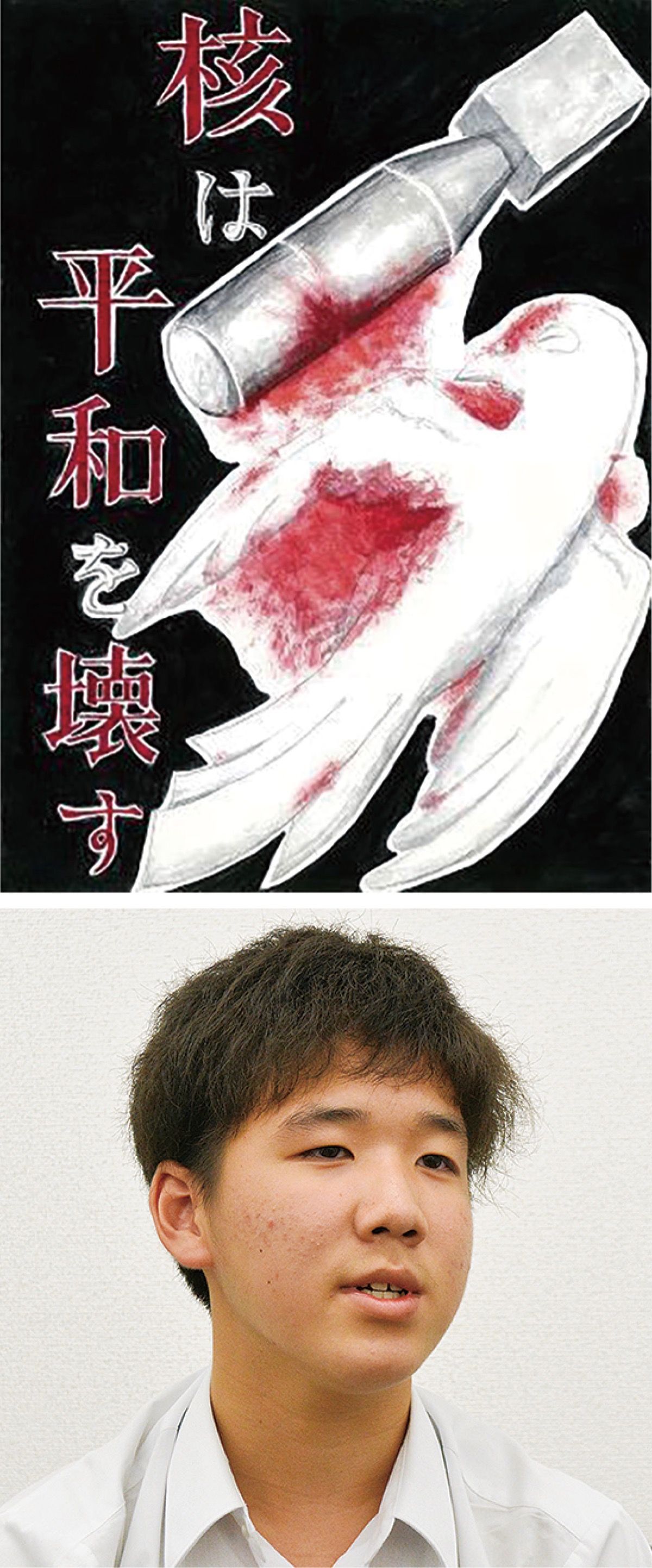 ポスターには血を流す白いハトと核兵器を描いた。「見たときに心を掴むには悲しい思いをさせるのも大事」。なぜハトが死んでいるのかを見た人に考えさせる作品にした。