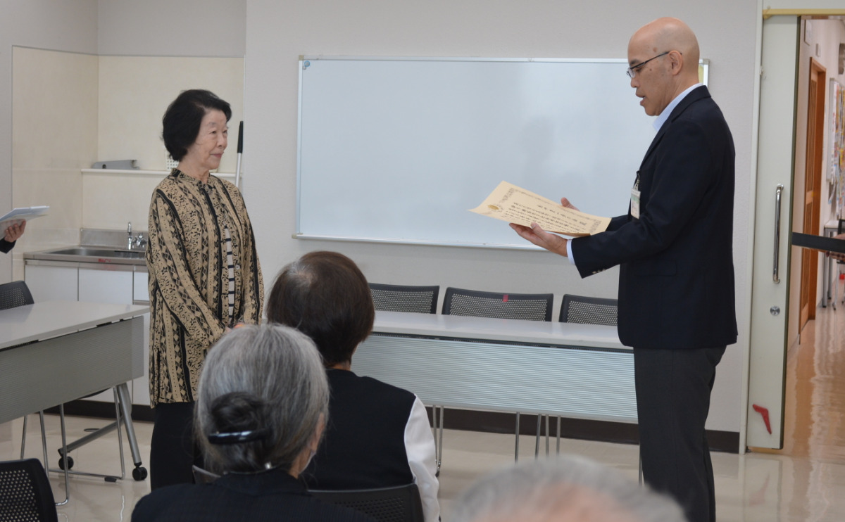 高齢者宅を訪問し生活支援を行う市民団体「おやま一歩の会」(宍戸佳子代表)が内閣府の「社会参加章」を受章し、10月7日に小山公民館(向陽町)で書状と記念品を受け取った。