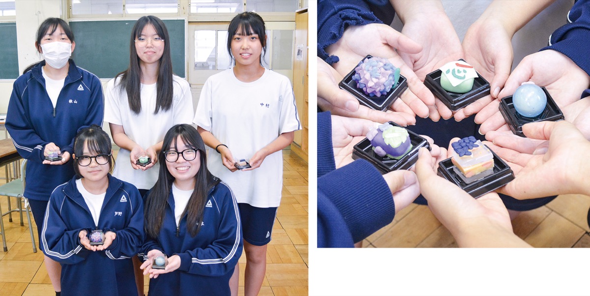 市立共和中学校の3年生が制作した和菓子のサンプルが現在、「宝来堂 伊藤製菓舗」(淵野辺)で展示されている。「相模原らしい」「おいしそう」「売っていたら食べてみたい」の3部門を基準に行われた校内投票で上位に選ばれた5作品が並ぶ。10月24日(金)まで。