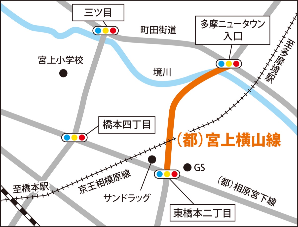 開通した宮上横山線は、東橋本2丁目交差点から、町田市の多摩ニュータウン入口交差点を結ぶ約670メートルの都市計画道路。道路の全幅は18メートルで車道は片側1車線。歩道は各4・5メートルあり、自転車通行帯も設けられた。開通により、国道16号の南橋本一丁目交差点から南大沢を越えて多摩川までが1本の道でつながったことになる。
