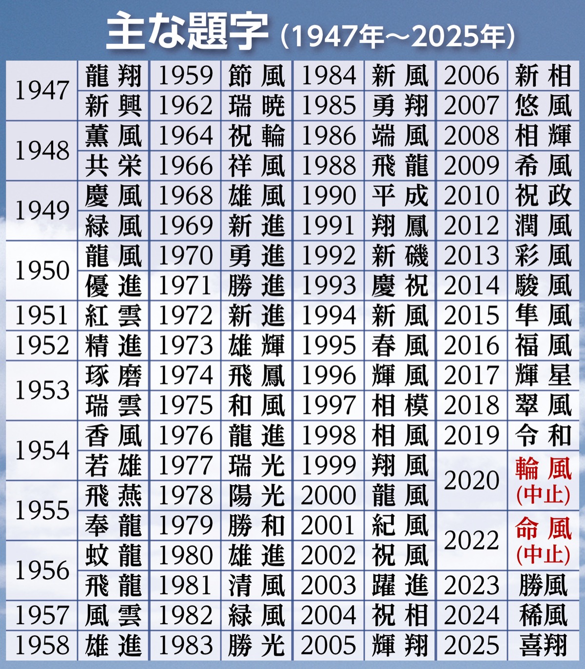市の担当者は2025年の題字の「喜翔」が大谷翔平選手の活躍ぶりに影響されたとし「その一年を表すものが選ばれやすい」という。