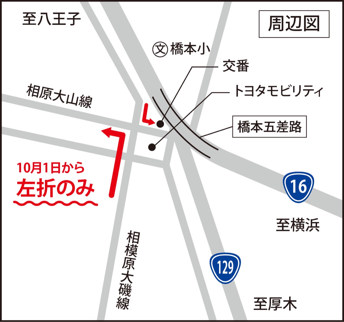 橋本五差路の西側、橋本五差路交番から50mほどにある相模原大磯線と相原大山線の交差点(橋本台1丁目)の通行方向について、南から北に向かって進入する車両は10月1日から左折のみとなった。