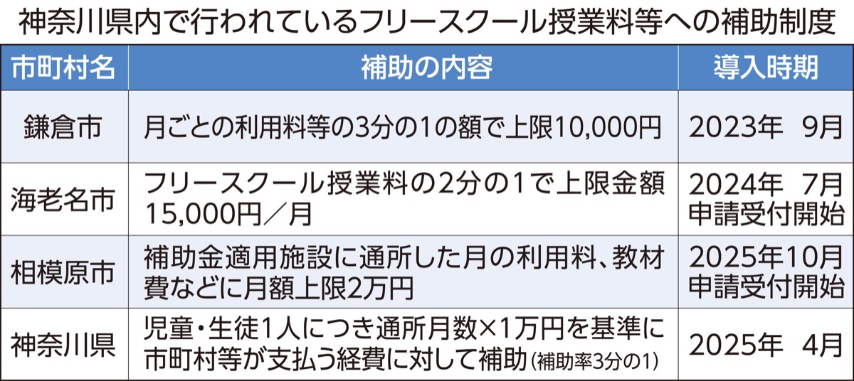 独自に保護者を支援する自治体も増えている。鎌倉市は23年9月、フリースクールの授業料等の一部を補助する制度を導入した。