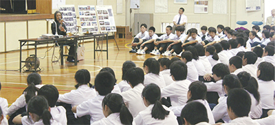 同校では今年度まで京都・奈良を修学旅行先としていた。現2年生が旅行する来年度は広島を訪れる。今回、「平和学習」に取り組んでいる同校が、戦争の話を聴くことで生徒に平和を願う気持ちを育ててもらおうと事前学習の一環として初めて会を実施した。体育館には同遺族会の協力で太平洋戦争の戦没者数や未帰還遺骨の概数などが記された資料約40点も展示された。