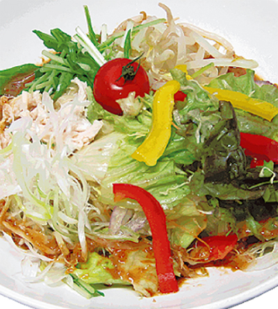 期間中は入浴、飲食に様々な”健康メニュー”が登場。自然の香りの「青竹風呂」、遠赤外線効果の「竹炭風呂」、そして温冷水のスカルプケアシャワーと、期間限定のオプションを楽しめるようになっている。また、飲食コーナーには「気くばり定食」「らーめんサラダ(=写真)」など、ヘルシーを意識したグルメも。なお、16日(木)、24日(金)〜26日は入浴回数券がお買い得となる(500円引き)。