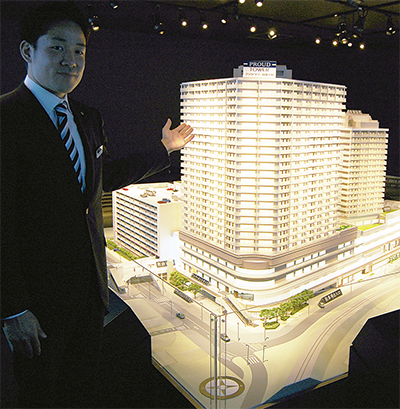 写真は約2年後の相模大野の未来予想図。野村不動産株式会社によって分譲される、駅北口西側再開発エリア内分譲マンション棟「プラウドタワー相模大野」などの1/75模型だ。