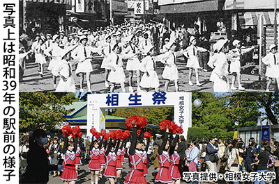 通信学校が誕生しても町が大きく発展した訳ではなかった。1945年4月13日の空襲で寮生ら4人を失い、校舎を消失した帝国女子専門学校が通信学校跡地に移った翌年も状況は同じで、相模女子大学の学園史を読むと、移転に当たり「都落ち」に対する相当の決断が必要であったことが分かる。駅前に数軒の商店、所々に建つ兵舎という風景は、東京・大塚の地とは雲泥の差があった。現在の東京農業大学(経堂)や昭和女子大学(三軒茶屋)の地も移転候補に挙がっていたが、この決断なくしては1949年に相模女子大学と改称することもなかったし、町の発展は大きく変わっていただろう。学園史には、地元の方々が当初から大学の開設を温かく支援してくれたことが書かれているが、これが相生祭(学園祭)恒例の園児から大学生までが参加する市中パレード(=写真)につながっている。大学も近隣地域との交流に力を入れており、市民大学は半世紀近い歴史がある。