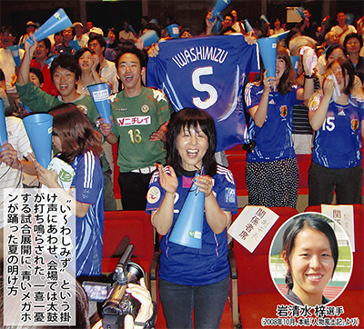 日本を救った、決死のスライディング―。このほど、「第6回女子ワールドカップドイツ大会」に出場した、サッカー日本代表”なでしこJAPAN”の岩清水梓(あずさ)選手(24/南区若松)らを応援しようと、アメリカとの決勝戦が行われた11日午前3時45分から、南市民ホール(南区相模大野)でパブリックビューイングが開催され、およそ250人の市民が集った。