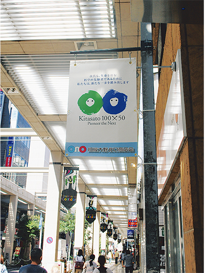北里大学(相模原キャンパス=南区北里)が今年、創立50周年を、北里研究所(東京都港区)が2年後の2014年に100周年を迎えるにあたり、学校法人北里研究所ではこの大きな節目の3年間を受けて、創立記念事業「Kitasato100×50 プロジェクト【未来科学の創造〜Pioneer the Next〜 】」を立ち上げた。今年に入ってから続々と記念行事を行っており、その一環として、先月末から相模大野北口商店会に記念フラッグ=写真が登場した。