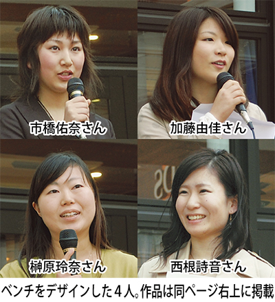 相模大野の魅力を再発見しようと活動する団体「相模大野宣伝部」(野村不動産(株)他)では、昨年からベンチ公募企画に着手。これは、市民から大野をイメージするベンチ案を募って具現化し、完成品を「ボーノ相模大野」に設置しようというもの。一般応募から4案が選出され、20日にはそれらの作者4人=写真、への表彰式が同施設で行われた。