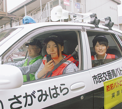 昨年7月に発足したグリーンシーガルは、相模女子の他、麻布や青山学院、北里など、現在全9大学、17人の学生で構成されている。これまでに市内の警察署や行政と連携を図り、防犯や交通安全キャンペーンなどを行ってきた。そして今回、高齢化や後継者不足などの問題を抱え、若い「学生の力」を要望した青パト隊と協力してパトロールを行う運びに。5月26日には出発式を行った。